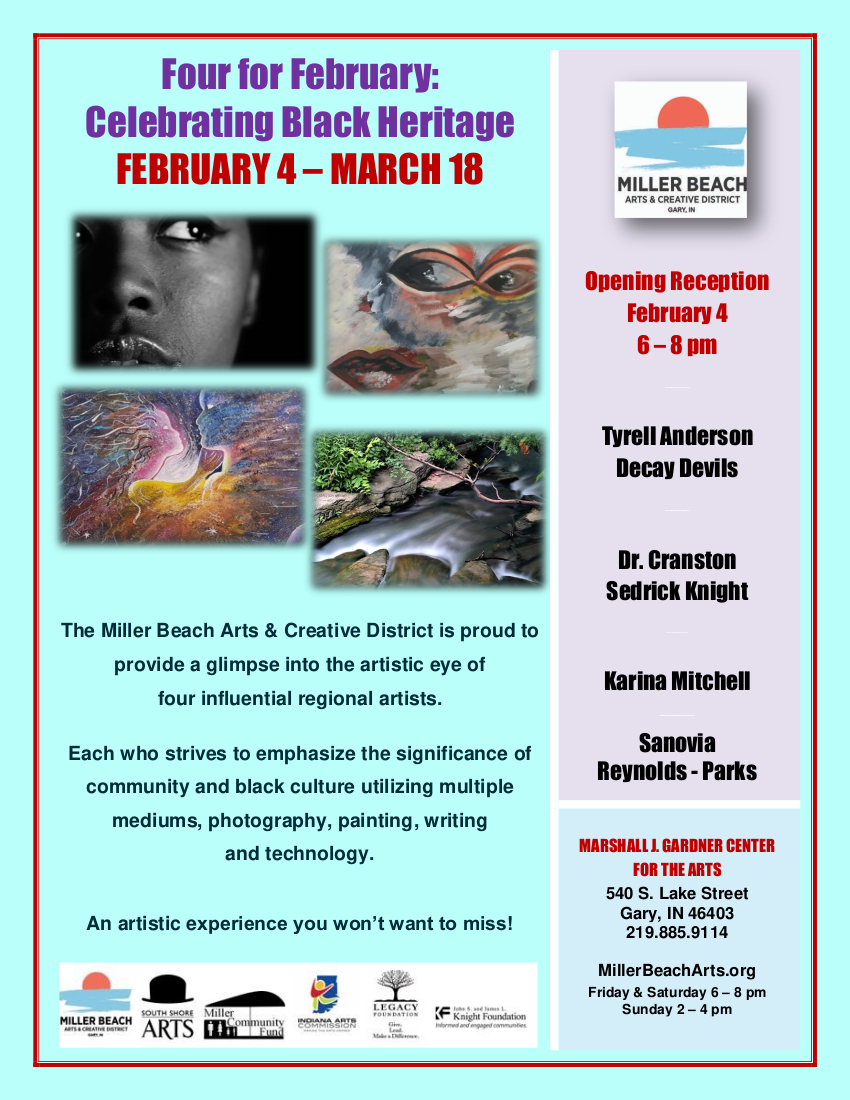 The Miller Beach Arts and Creative District is proud to provide a glimpse into the artistic eye of four influential regional artists: Tyrell Anderson of the Decay Devils, Dr. Cranston Sedrick Knight, Karina Mitchell, and Sanovia Reynolds–Parks. Each who strive to educate the significance of community and black culture utilizing multiple mediums, photography, painting, writing and technology.