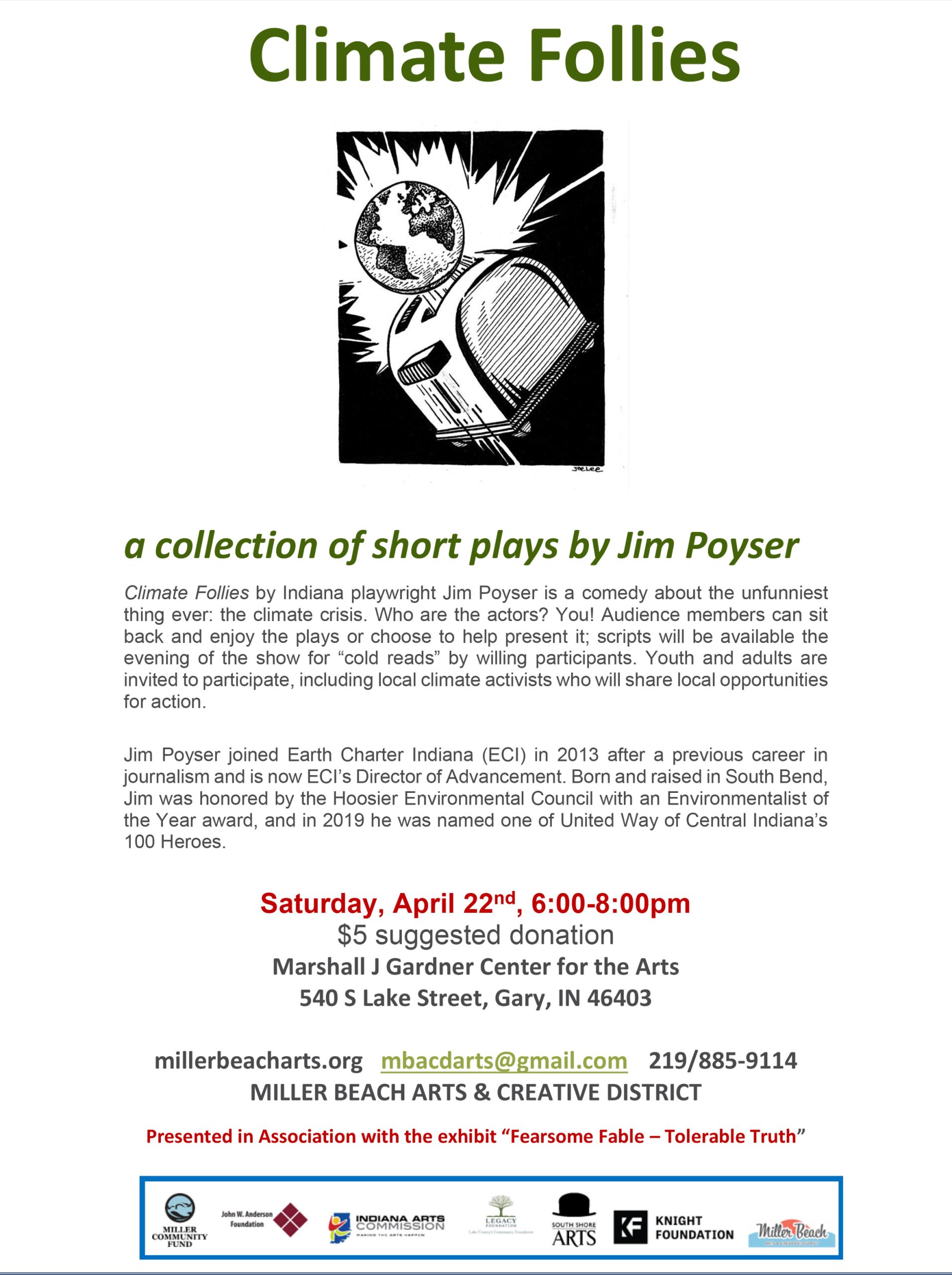 Climate Follies by Indiana Playwright Jim Poyser is a comedy about the unfunniest thing ever: the climate crisis. Who are the actors?? YOU!! Audience members can sit back and enjoy the plays or choose to help present them; scripts will be available the evening of the show for “cold reads” by willing participants. Youth and adults are invited to participate and local climate activists will share opportunities for action.