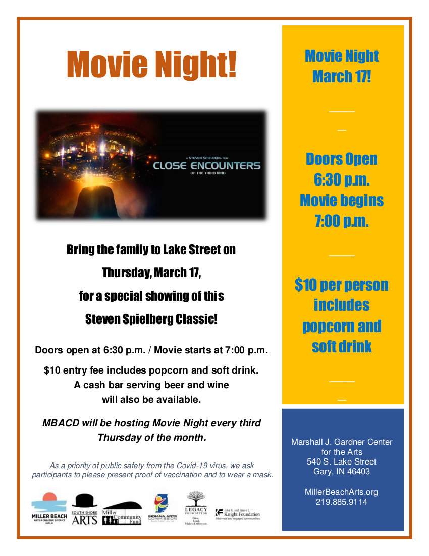 The film tells the story of Roy Neary, an everyday blue-collar worker in Indiana, whose life changes after an encounter with an unidentified flying object. Doors open at 6:30 p.m. and movie starts at 7:00 p.m. $10 entry fee includes popcorn and soft drink. A cash bar serving beer and wine will also be available. MBACD will be hosting Movie night every third Thursday of the month.