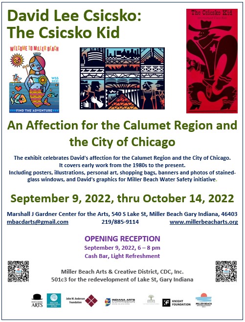 This exhibit celebrates David’s affection for the Calumet Region and the City of Chicago. It covers early work from the 1980’s to the present, including posters, illustrations, personal art, shopping bags, banners, and photos of stained-glass windows, and David’s graphics for the Miller Beach Water Safety initiative.