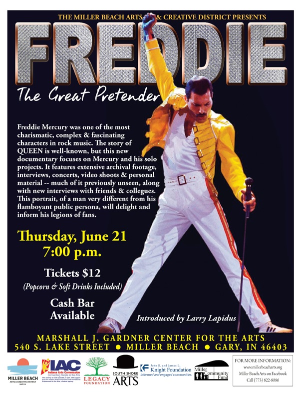 Audiences who want to spend some quality time with their “Best Friend” can attend “Freddie Mercury: The Great Pretender” Thursday, June 21 at 7:00 p.m. at the Marshall J. Gardner Center for the Arts, 540 S. Lake St., Gary, IN. A $12 donation includes admission to the screening, soft drinks, popcorn, and an introduction by Larry Lapidus. There will be a cash bar.