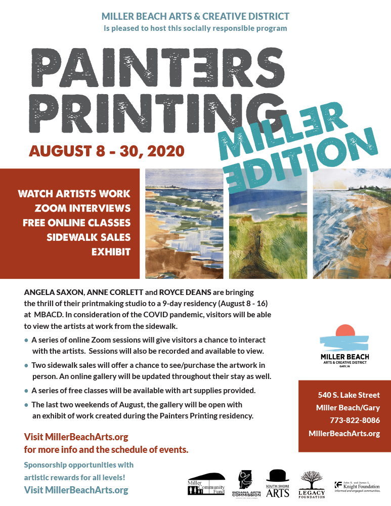 In addition to creating a body of work based on the Miller Beach landscape, the artists will also create a signature poster available only to sponsors. Working from a panoramic viewpoint of the Miller Beach lakeshore, each artist will represent one third of the view. The three monotypes will be presented together in this signature poster. Donate at the $1000 level and you will receive all 3 original prints from this signature poster!