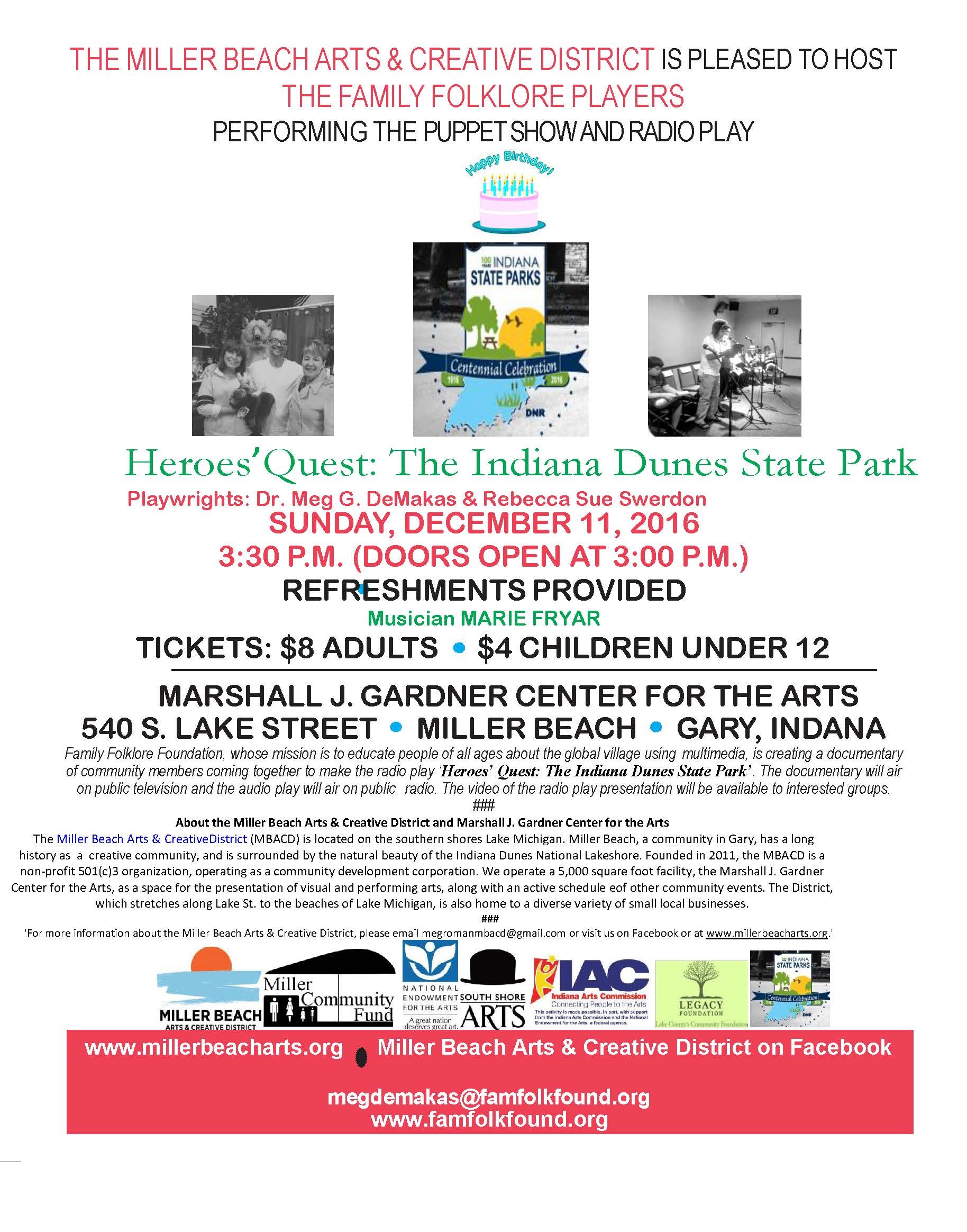 December 11, 2016-– Celebrate Indiana’s Park System’s 100th birthday with Family Folklore Foundation and the Miller Beach Arts & Creative District (MBACD)! MBACD is pleased to host an afternoon of fun, food, and family at the Marshall J. Gardner Center for the Arts located at 540 S. Lake Street, Gary/Miller Beach, IN. The Family Folklore Players will perform a lively puppet show with Duneland creatures and an original play, “Heroes’ Quest: the Indiana Dunes State Park”. Tickets are $8 for adults and $4 for children under twelve. The play performance is 3:30 pm to 4:30 pm. Doors open at 3:00. At intermission enjoy light snacks. There is live music and sound effects performed by Marie Fryar. Tickets are $8 for adults and $4 for children under twelve. This is the Family Folklore Players debut performance of the puppet show, so be sure to bring the kiddies for the fun! This radio play is the third in an original series and it features a life-size time machine that really works! Go back and forth in time meeting nature enthusiasts Abe and Teddy to mention a few! As an oasis from the daily, urban rat race, “Heroes’ Quest: The Indiana Dunes State Park” Radio Play and Puppet Show will transport the audience into an exciting, informative space where outdoor fun at the Dunes abound. Over the course of the play the young Granville clan discovers the true concept of the heroes that Saved the Dunes will be formulated via the inspiring performances of our local community members. There is even a documentary and audio version of the play being produced that will be available in the spring.