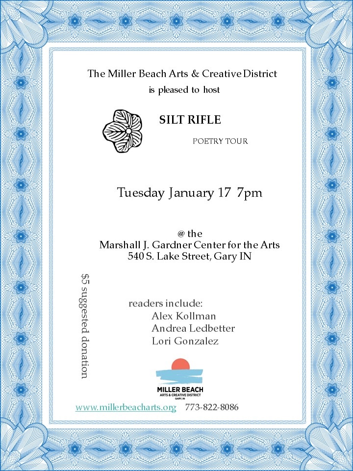 Come in out of the rain and listen to live poetry by Chicago poet Alex Kollman who has included Gary’s Miller Beach on his midwest poetry tour. Local poets Andrea Ledbetter and Lori Gonzalez (of DecayDevils fame) will also be reading their poems at the Miller Beach Arts & Creative District – 540 S. Lake Street. Suggested donation of $5 can be contributed at the door.