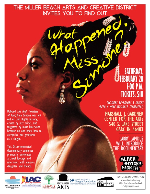 “What Happened, Miss Simone?” will screen Saturday, February 20 at 7 p.m. at the Marshall J. Gardner Center for the Arts, 540 S. Lake St., Gary, IN. A $10 donation includes admission to the screening, snacks, and the introduction by Larry Lapidus. Beer and wine will be available at an additional cost.